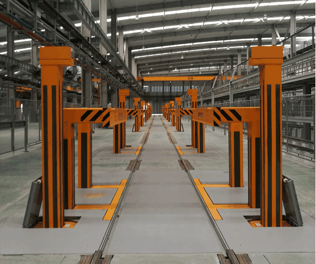 固定式架車機組安裝在地下基坑內(nèi),可完成對單節(jié)車或任意連續(xù)編組的架、落車作業(yè)。